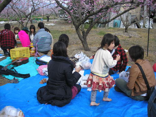 来て頂いた方にお菓子やお飲み物を出して ブルーシートに座ってお弁当
