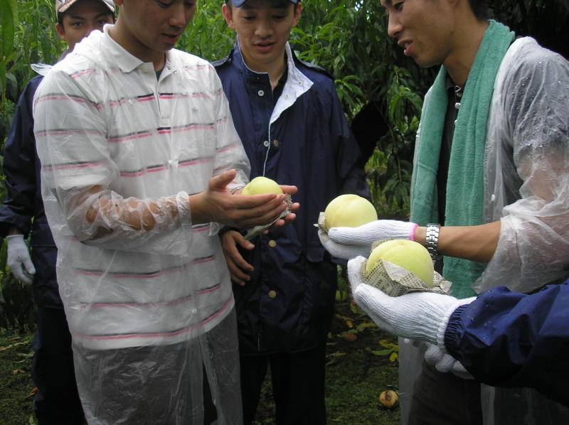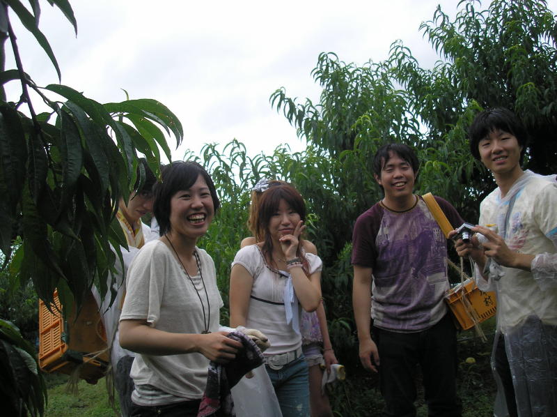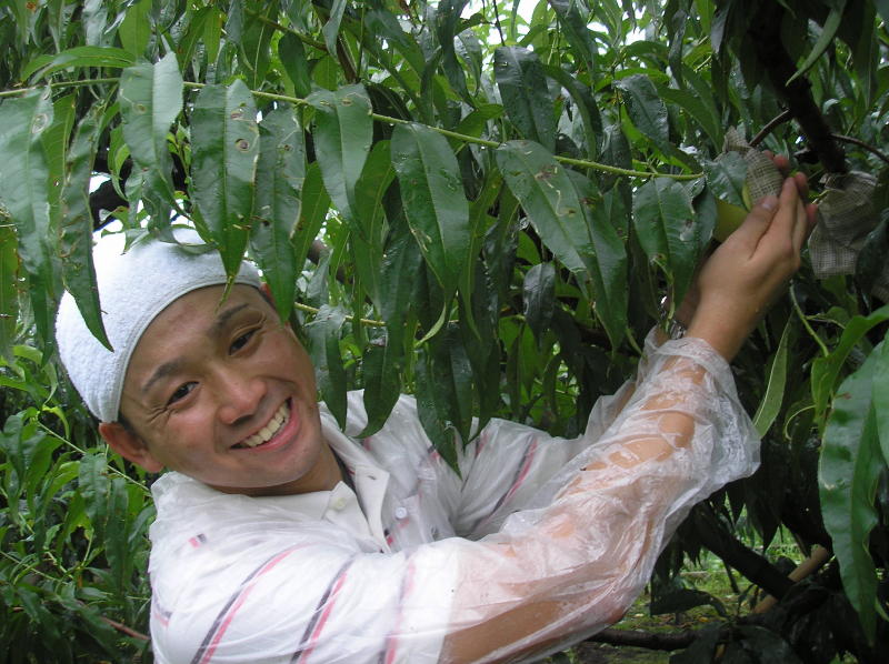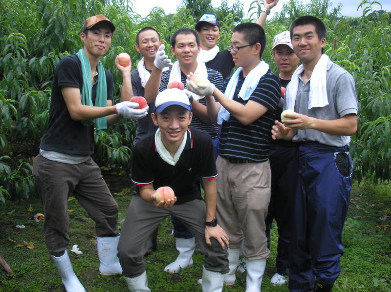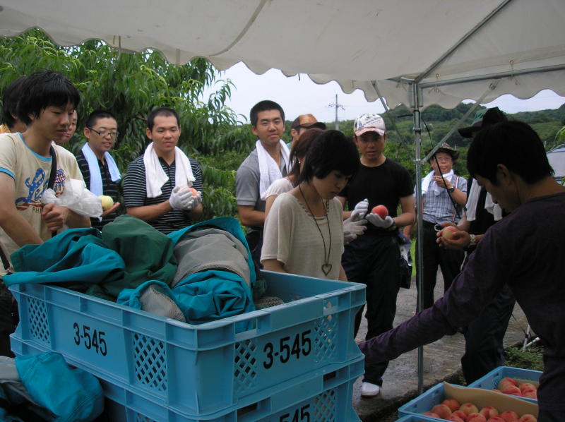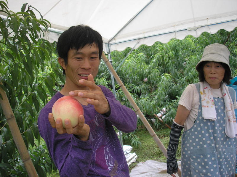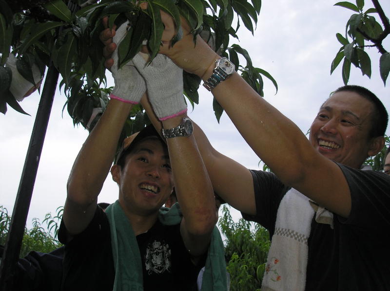 男二人で桃をがっつり取ってます でかぁ〜 テントの下で選別 桃の説明しています 男8人みんな笑顔いっぱいです